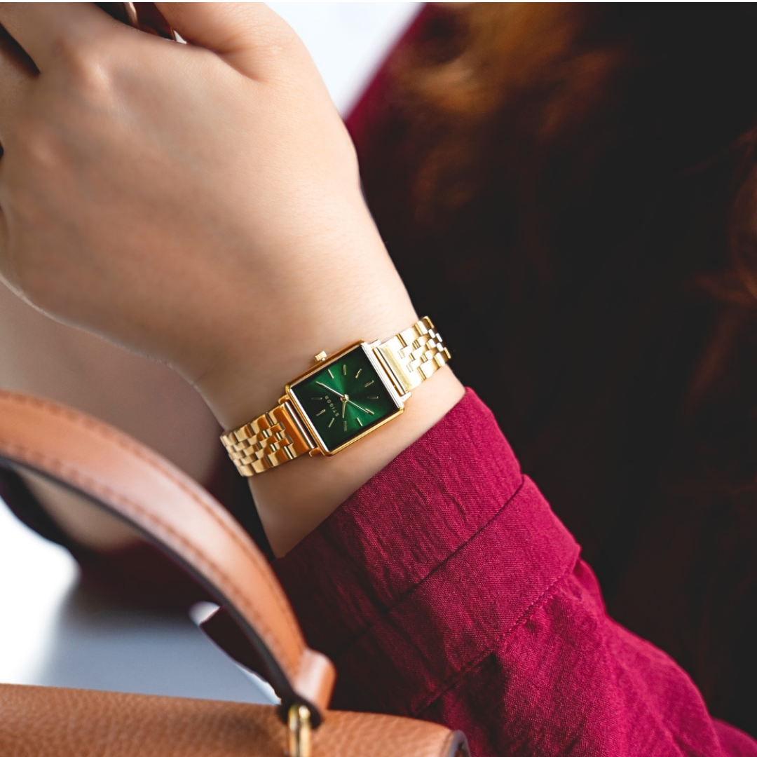 At its core lies a refined sunray silver dial, designed to catch the light with every movement — a subtle shimmer that mirrors the sophistication of the woman who wears it. The graceful silhouette of the petite square dial is balanced by the heritage-inspired bracelet, evoking a sense of tradition reimagined for the modern muse.